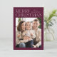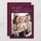 Cartões de foto de Natal moderno com "Feliz Natal", apresentado no topo da design em letra branca tendenciosa com fundo de cor de vinho. Personalize o simples cartão de Natal com seu nome de família e foto. A placa reverte para exibir um fundo de vinho com sutis pontos brancos (neve).