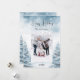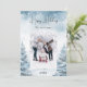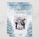 Floresta de inverno moldada como fundo. Personalize e adicione seu nome de família e uma foto. Sobreposição de neve. Feliz feriado escrito com um script de estilo manchado de tendências. Voltar: adicione sua mensagem e nomes.
