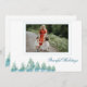 Cartão de Feriado de Natal Péssimo para a Floresta de Inverno Aquarela. Desenho de aquarelas das árvores no inverno, floresta de inverno com neve em cores azul e verde. O design é tranquilo e calmo com um modelo de foto e texto na frente e no verso em um roteiro elegante. Personalize o texto e adicione sua foto.