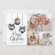Envie votos calorosos de férias com este cartão de Natal elegante e plano, agora com um novo layout com o design na frente esquerda e uma colagem de 3 fotos no lado direito da frente. A obra de arte inclui três enfeites em preto e branco em aquarela acentuados por folhagens verdes e detalhes delicados de laço, criando um visual elegante e festivo.