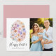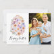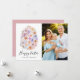 Cartão com fotos simples e giro, com rosa cor-de-rosa-rosa, pêssego, azul-claro e violeta-cor-de-água, arranjado em forma de ovo de Páscoa. "Felz pascoa" é exibido em um roteiro de caligrafia moderno com seus nomes mostrados abaixo. A placa de Páscoa floral reverte para um fundo rosa sólido empoeirado com espaço para texto e imagens adicionais.