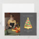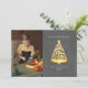 Ilustração de uma fatia de pizza em forma de árvore de Natal decorada com coberturas vermelhas e verdes e uma estrela no topo. Personalize o nome, o ano e a foto. O fundo é inspirado em quadro-negro.