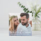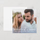 Cartão de foto de casamento moderno de Natal casados e alegres com ombre azul. Sobreposição de tipografia clássica e caligráfica. No verso do cartão há ilustração azul de folhagens em verde com um monograma e data. Mensagem-me se precisar de ajuda ou tiver algum pedido especial.