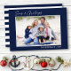 Placa de Férias de Caneta com Manuscrito Manuscrito de Script e Saudações de Elegância Minimalista Moderna - Marinho Blue & White Strips