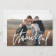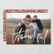 Cartão com fotos moderno de Ação de Graças, com a palavra "Obrigado" em uma cobertura de script com letra branca. Personalize a parte frontal da placa adicionando sua foto horizontal com sangramento de cheio, seu nome e o ano. O cartão de Ação de Graças se reverte para apresentar um padrão de folhagem branco e um fundo castanho sólido (ou cor de sua escolha).