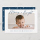 Cartão com fotos de feriado bonito e moderno com a frase "Feliz e Brilho" em um roteiro com marinho escrito à mão. Sua foto horizontal é exibida com uma borda branca e dura. Personalize a frente da placa adicionando uma saudação personalizada e o nome da sua família. A placa se reverte para exibir um plano de fundo de marinho com um padrão brilhante de estrela branco.