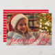 O cartão com fotos sazonal apresenta um design de cobertura de script de caligrafia manuscrito vermelho "Paz e Alegria" com cores vermelhas, com texto serif personalizado moderno que pode ser personalizado com o ano e sua família / nome. A parte traseira da placa inclui faixas horizontais brancas abstrato com fundo vermelho.