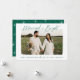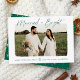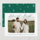 Celebre seu primeiro Natal como um casal casado com nosso cartão com fotos de feriado Casado e Bright! O cartão apresenta "Casado e Brilho" num programa verde moderno, escrito à mão. Sua foto horizontal de casamento é exibida com uma borda branca e dura. Personalize a frente da placa adicionando uma saudação personalizada com os nomes mostrados abaixo. A placa reverte para exibir um fundo verde com um padrão brilhante de estrela branca.