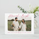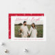 Celebre seu primeiro Natal como um casal casado com nosso cartão com fotos de feriado Casado e Bright! A placa apresenta "Casado e Brilho" em um script vermelho moderno, escrito à mão. Sua foto horizontal de casamento é exibida com uma borda branca e dura. Personalize a frente da placa adicionando uma saudação personalizada com os nomes mostrados abaixo. A placa reverte para exibir um fundo vermelho com um padrão brilhante de estrela branca.