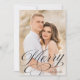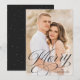 Cartão de feriado elegante com sua foto vertical com "Feliz" exibida em uma cobertura de script de caligrafia de cinza com um gradiente branco opcional. Personalize a frente do cartão de feriado de script de caligrafia adicionando seu nome abaixo. O cartão com fotos de férias reverte para um sutil padrão branco de neve com um fundo de carvão escuro.