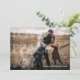 Cartão de Natal tipográfico moderno, com fotografia de família impressa à borda, o ditado festivo "amor, paz, alegria" numa moderna fonte branca esboçada, o seu nome e o ano.