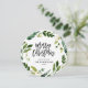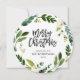 cartões com fotos de feriado personalizados com barato simples para personalização. Esta design de diversão apresenta uma forma recortada em círculo com uma camada floral de cor d'água de verde e flores brancas sobre um fundo branco. O texto diz "Feliz Natal" em uma letra escrita de pincel escrita à mão. Personalize-o com seus nomes familiares, o ano ou outro texto personalizado. O verso tem espaço para a sua foto ou texto adicional. Use as ferramentas de design para editar o texto, adicionar mais fotos e criar um Cartões de foto de Natal redondo exclusivo.