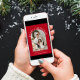 Cartão de saudação de férias vermelho elegante com sua foto em uma moldura de arco, rodeado por "Feliz Natal" em tipografia clássica branca serif e uma saudação sazonal e o nome da sua família em tipografia moderna simples branca. No interior, personalize sua mensagem para amigos e familiares.