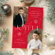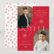 Deseje aos entes queridos uma feliz temporada de festas enviando-lhes um cartão de festas de tendências projetado por Late Bloom Paperie! O cartão de feriado exclusivo apresenta duas fotos dentro de um quadro fotográfico em arco vermelho. "Joyful" é exibido em letras brancas modernas, acentuadas por flocos de neve desenhados à mão. Personalize a frente do Cartões de foto de Natal adicionando uma mensagem, um nome e um ano personalizados. A parte traseira do cartão de feriado multifoto exibe um padrão vermelho de floco de neve.