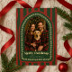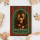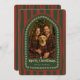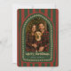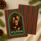 Enviar desejos de férias a amigos e familiares com este cartão de feriado fotográfico, desenhado à mão, elegante. Apresentando um esquema de cores verde e vermelho vintage com fundo de padrão de faixa desenhado à mão e quadro de fotos de arco, emparelhado com fonte retrorativa que lê 'Feliz Natal' com uma nota personalizável que lê ' With Love, {Family Name}'. A parte traseira da placa apresenta um fundo rispado em negrito com um detalhe sutil de flocos de neve.