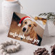 Cartão de Natal temático de cão fofo com a foto horizontal do seu cão na frente com "desperte a alegria" exibido em letras brancas em negrito. Personalize o cartão de Natal do cão adicionando uma saudação personalizada, seu nome e uma mensagem personalizada. O verso do cartão apresenta um padrão de pegadas de patas vermelhas e brancas.