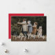Cartões com fotos modernos de feriado com sua foto horizontal com "Feliz ano novo" exibido em um script manuscrito branco. Personalize o cartão de Ano Novo com seu nome de família e o ano. A placa de feriado de fotos do solteiro é revertida para exibir um fundo vermelho com sutis pontos brancos.