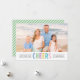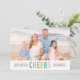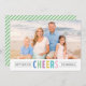 O cartão com fotos de feriado simples e moderno apresenta a sua fotografia com uma redação multicolorida de "Cheers" e texto personalizado para uma mensagem sazonal, o seu nome de família e o ano. A parte traseira do cartão inclui um padrão de faixas diagonais. Cores alegres, perfeitas para uma foto de verão/férias, incluem azul-céu, verde-menta, roxo violeta, amarelo-ouro, azul-turquesa/azul-lacre e rosa claro.