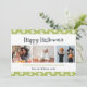 Cartão verde moderno de Halloween com um padrão de impressão de pata e 3 fotos no meio. Personalize facilmente este cartão fotográfico do Dia das Bruxas com as suas imagens, texto e nome da sua família.