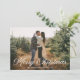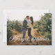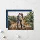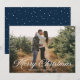 Cartão com fotos moderno de férias com sua foto horizontal com "Feliz Natal" exibido em uma cobertura de script de caligrafia branca. Personalize a frente do Cartões de foto de Natal com seu nome de família e o ano. A placa se reverte para exibir um padrão de marinho e neve branca.