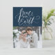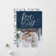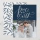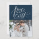 Envie cartões de natal amados em estilo com nosso cartão com fotos de feriado do Peace On Earth Lettered Script. O cartão de cartões de natal apresenta "Paz na Terra" em um roteiro branco, escrito à mão contra um fundo de marinho. Personalize o cartão de feriado elegante adicionando seu nome e uma foto. A placa se reverte para um padrão de ramificações e pontos de pinheiro branco e marinho.