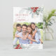 Este cartão de Natal moderno apresenta elegante verde de inverno e bagas e oferece espaço para duas fotos. O design é acentuado com o texto de estilo manuscrito de tendência. A sofisticada saudação diz "Saudações da Estação".