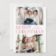 Cartões de foto de Natal moderno com "Feliz Natal" exibido no centro da design em letras vermelhas de tendência com um fundo branco. Personalize o simples cartão de Natal com seu nome de família e duas fotos horizontais. A placa se reverte para exibir um fundo vermelho com sutis pontos brancos (neve).
