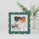 Cartão festivo quadrado com foto de sua família, em branco, com um fundo de padrão nórdico verde e branco. Personalize o cartão de Natal nórdico do floco de neve com sua saudação personalizada e seu nome familiar em caracteres verdes. O cartão se reverte para exibir sua mensagem pessoal.