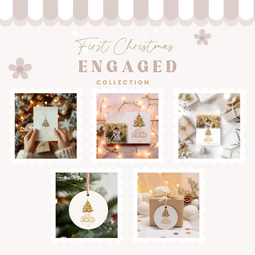 Celebre seu noivado com este cartão elegante e festivo com um ouro floral de árvore de Natal e espaço para sua foto favorita. Uma maneira quente e alegre de marcar sua primeira temporada de festas juntos.