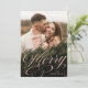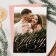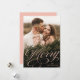 Cartão de feriado elegante com a sua foto vertical com "Feliz" exibida em uma cobertura de script de caligrafia rosa pincelada. Personalize a frente do cartão de feriado de script de caligrafia adicionando seu nome abaixo. O cartão com fotos de férias reverte para um sutil padrão de neve branca com um fundo rosa-claro.