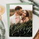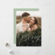 Cartão de feriado elegante com sua foto vertical com "Feliz" exibida em uma cobertura de script de caligrafia verde de sábio. Personalize a frente do cartão de feriado de script de caligrafia adicionando seu nome abaixo. O cartão com fotos de férias reverte para um sutil padrão branco de neve com um fundo verde sábio.