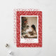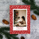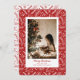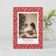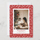 Este cartão festivo vertical apresenta uma fotografia de solteiro sobre um padrão botânico branco e vermelho de Natal desenhado pela mão.