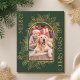 Compartilhe uma memória apreciada com este cartão de Natal luxuoso com a sua foto de feriado favorita. Um impressionante e rico fundo verde é maravilhosamente enquadrado por ilustrações florais e botânicas intrincadas e inspiradas em folha de ouro, levando o olho para o seu conjunto de imagens personalizado dentro de um quadro arquitetado gracioso. O design evoca o calor e a maravilha das férias de inverno, fazer a forma perfeita de enviar os vossos desejos mais calorosos escritos pelas costas.