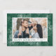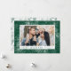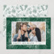 Cartão de feriado elegante com sua foto horizontal moldada por flores de poinsettia desenhadas por canetas brancas, pinecones e grampos de pinheiro em um fundo verde festivo. "Felizes Feriados" aparece em caracteres clássicos verdes, com o nome da sua família à direita. O cartão de férias moderno reverte para mostrar um padrão botânico verde correspondente.