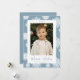 Cartão com fotos de feriado bonito com sua foto vertical moldada em branco com um fundo de flocos de neve azuis e brancos. "Desejos quentes" é exibido em um roteiro azul-branco. Personalize o cartão com fotos de festas de neve com o ano e seu nome familiar. A placa reverte para exibir sua mensagem personalizada em letras brancas com um fundo azul de gelo sólido.
