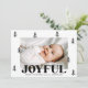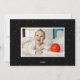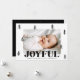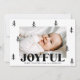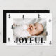 Cartão de Natal festivo com a sua fotografia horizontal rodeada por pinheiros pretos desenhados à mão e com fundo preto. "Joyful" é exibido em letras negros com sua saudação personalizada e seu nome de família mostrado abaixo. A alegre carta de Natal reverte para exibir uma foto adicional e um fundo preto com sutis pontos brancos.