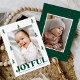 Cartão de Natal Festivo com a sua foto vertical cercada por pinheiros verdes desenhados à mão com fundo branco. "Joyful" é exibido em letras verdes em negrito com sua saudação personalizada e seu nome de família mostrado abaixo. O alegre cartão de Natal reverte para exibir uma foto adicional e um fundo verde com sutis pontos brancos.