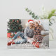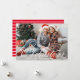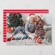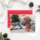 O cartão com fotos sazonal apresenta um design de cobertura de script de caligrafia manuscrito branco "Feliz Natal" com texto serif personalizado que pode ser personalizado com o ano e sua família / nome. A parte traseira da placa inclui faixas horizontais brancas abstrato com fundo vermelho. Observe que a cor vermelha de fundo impressa pode ser modificada (consulte a opção Personalizar Mais em Personalizar este modelo) para coordenar com sua foto.
