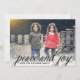 O cartão com fotos sazonal apresenta um design de cobertura de script de caligrafia manuscrito preto "Paz e Alegria" com texto serif personalizado moderno que pode ser personalizado com o ano e sua família / nome. A parte traseira da placa inclui faixas horizontais brancas abstrato com fundo preto.