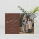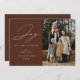 Cartão de Natal moderno com a frase "Alegria ao Mundo" em elegante letra cursiva branca com fundo marrom. Personalize a frente do cartão de Natal elegante com o nome da sua família, ano e foto vertical.