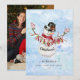 "Foto Papai Noel Boneco de Neve Aquarela Feliz Natal Cartão de Férias," adorável clássico boneco de neve retrô segurando uma faixa com texto estilizado, "Feliz Natal!" Um fundo de aquarela moderna com neve caindo completa o design. Três linhas de texto personalizadas com o nome da sua família ou mensagem. Arte pintada pela artista e designer licenciada internacionalmente, Audrey Jeanne Roberts, direitos autorais.