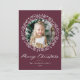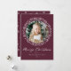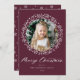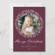 Cartão de Natal elegante com sua foto cercada por uma coroa de flocos de neve e galhos de pinheiro branco em um fundo roxo de morango festivo. O "Feliz Natal" é apresentado num roteiro de caligrafia branco ousado com o seu nome e o ano apresentado abaixo. A parte de trás do cartão de feriado moderno apresenta um lindo padrão de flocos de neve.