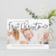 A design na frente consiste na tipografia cursiva lúdica de "Primeiro Natal". Adicione uma foto personalizada do seu novo bebê e adicione o nome do bebê e da família. Este design é moderno, chique, brincalhão e divertido.