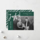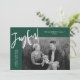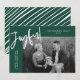 Envie alegria aos amigos e à família com um cartão de férias simplesmente alegre de Late Bloom Paperie! O cartão de feriado moderno apresenta "Joyful" em um roteiro branco de pincel com um fundo verde escuro. Personalize a frente da placa adicionando sua foto, saudação personalizada, nome da família e ano. A placa reverte para exibir um padrão de faixa diagonal verde e branca.