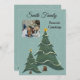 Imaginem um cartão com fotos encantador que captura a magia das férias. Cartão delicioso mostrando uma árvore esbranquiçada e verde cercada por flocos de neve brancos suaves. A árvore, embelezada com delicadas linhas de neve, se posiciona graciosamente contra um pano de fundo azul-esverdeado, exuando uma atmosfera quente e convidativa. O cartão apresenta uma fonte divertida e cursiva para a saudação, o desejo de calor e alegria para o feriado. Esta carta captura lindamente o espírito encantador do Natal.