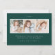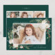 Cartão de Natal elegante mostrando sua foto favorita na frente, emoldurada por buquês de flores de marfim aquarela, folhagem verde-luxuosa, cones de pinheiro e bagas ocas contra fundo verde-florestal. Personalize a frente da placa adicionando uma saudação personalizada e seu nome. O verso exibe mais 3 fotos com espaço para o ano, uma mensagem personalizada e os nomes de sua família em um fundo verde. Projetado para coordenar com a nossa coleção de férias do Winter Floral.