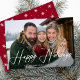 Cartão com fotos moderno de feriado com "feriados felizes" exibido em um script branco manuscrito sobre sua foto horizontal. Personalize a frente do cartão com fotos de férias com seu nome de família e o ano. A carta se inverte para um padrão vermelho e branco de floco de neve.