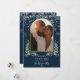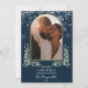 Cartão de Natal elegante com moderno arco de ouro, vegetação em aquarela e flocos de neve caindo sobre um fundo azul-marinho. Personalize com sua mensagem especial de Natal, nomes e ano. Criado por Thisisnotme©