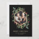 Este belo cartão de Natal apresenta a foto da sua família, rodeada por uma moldura geométrica em dourado falso com folhas douradas correspondentes, folhagem de Natal e frutos de azevinho vermelhos em um fundo preto moderno. O texto elegante diz "Feliz Natal", mas você pode alterá-lo para o seu próprio cumprimento de festas felizes.