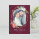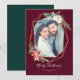 Este cartão de Natal elegante apresenta uma bela moldura geométrica dourada decorada com buquês florais festivos de Natal, tudo contra um fundo vermelho festivo. Os buquês são compostos por rosas, poinsettias, pinhas, frutas vermelhas e ramos de pinheiro. Personalize com uma saudação de Natal personalizada, seus nomes e foto favorita. A parte de trás do cartão é uma linda tonalidade de verde floresta, mas é personalizável para qualquer cor que você desejar!